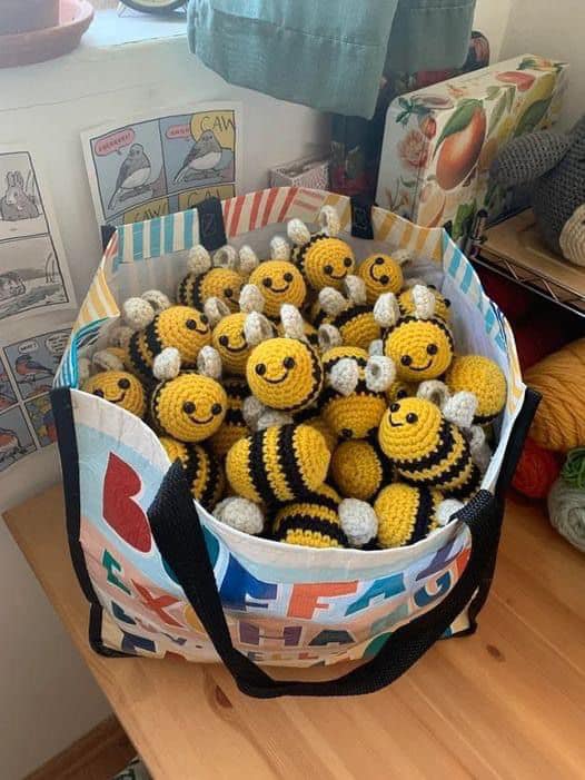 120 bees, made by my husband. My son says he is ashamed of his crocheter father. My husband is proud.